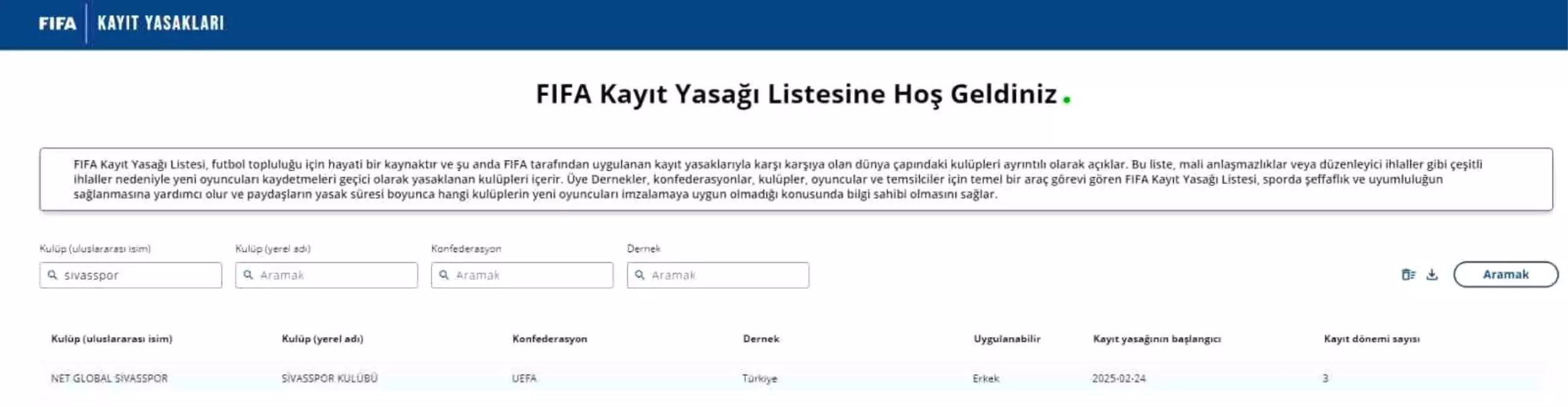 FIFA, Trendyol Süper Lig ekiplerinden Sivasspor’a 3 dönem transfer yasağı getirildiğini açıkladı.